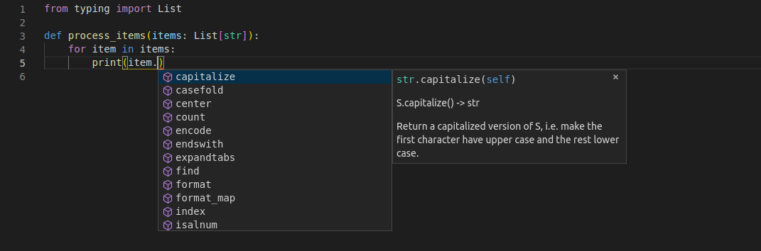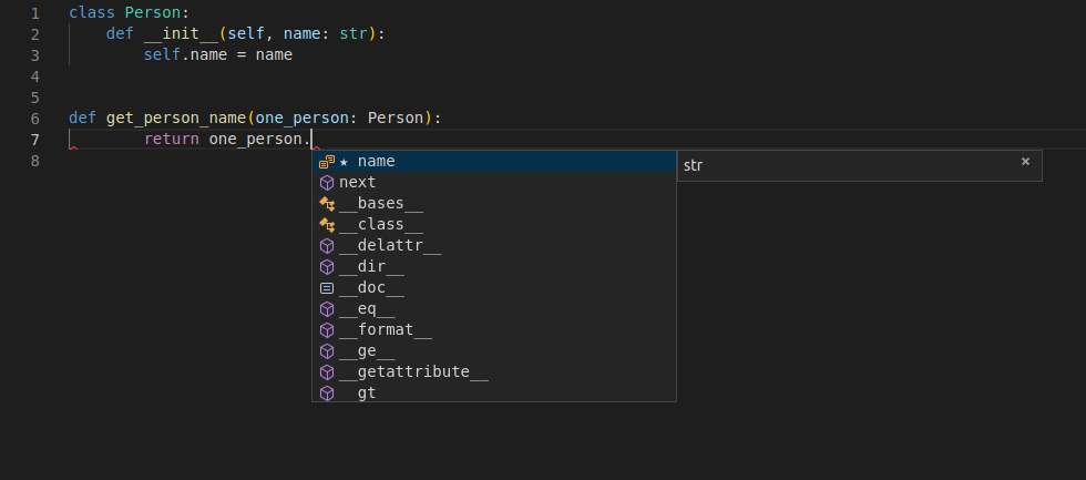 And still, the editor knows it is a str, and provides support for that.